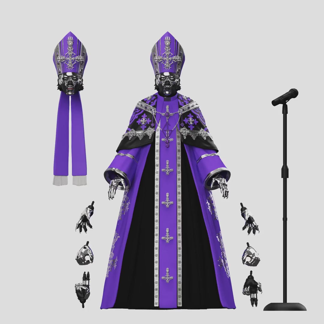 intricate sculpt and vac metal paint detailing that captures every ornate flourish of his ever-enigmatic presence. Draped in a flowing soft goods robe with detailing approved by The Clergy and worthy of his station, he arrives with two interchangeable heads and eight interchangeable hands, allowing you to display him in all his theatrical splendor. And, of course, he comes equipped with his tools of the trade—a microphone and stand—so he can deliver his haunting sermon among your collection. Encased in collector-friendly window box packaging, this figure is as much a relic as it is a revelation. Will you heed the call and usher Papa V Perpetua into your unholy sanctuary?