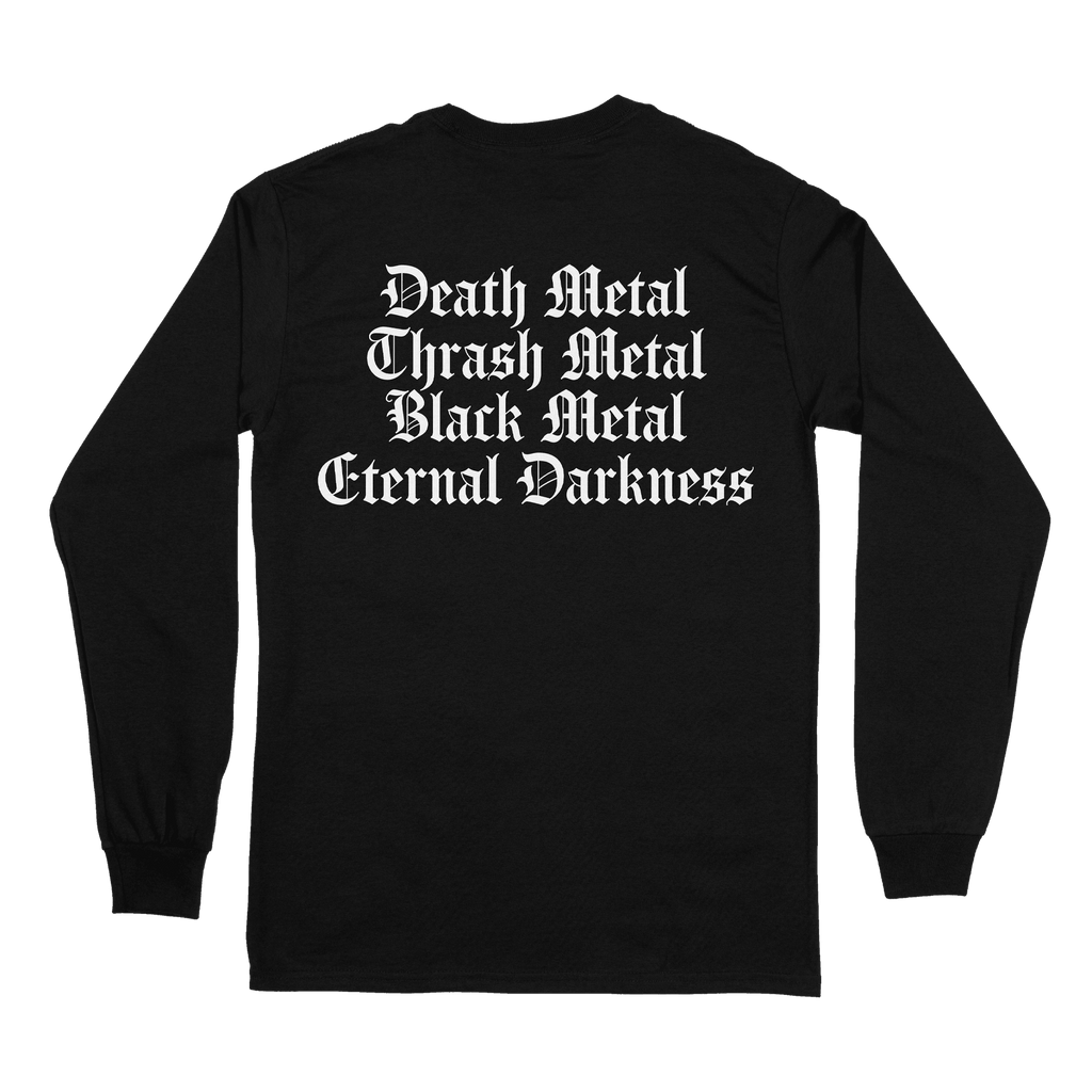 Crafted in the deepest void known to man, this long sleeve is ideal for all social or ritual gatherings. Whether you're in the pit or the Norwegian backwoods, this long sleeve will so boldly hail to you.